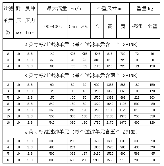 1.自動(dòng)疊片過濾單元有 2″、3″、4″、6″、12″可選,每個(gè)單元由濾殼與濾芯組成。濾殼為標(biāo)準(zhǔn)部件,材質(zhì)有纖維增強(qiáng)尼龍、PP、不銹鋼、聚酯噴涂碳鋼等多種選擇。各個(gè)精度的濾芯為同一尺寸規(guī)格,疊片材質(zhì)有 PP與尼龍可選,疊片兩面注有正三角形溝槽,溝槽內(nèi)切圓直徑為疊片的過濾精度。一定數(shù)量的疊片穿在一個(gè)內(nèi)撐上,并在上蓋壓緊后便形成一個(gè)自動(dòng)疊片濾芯。內(nèi)撐在過濾時(shí)起到壓緊疊片的作用,反洗時(shí)起到松開疊片,并向疊片噴射沖洗水的作用。