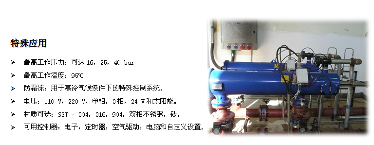 具有時(shí)間清洗功能(由運(yùn)營商預(yù)設(shè)),確保在壓力損失沒有達(dá)到預(yù)設(shè)值的情況下,沖洗自動的進(jìn)行。
